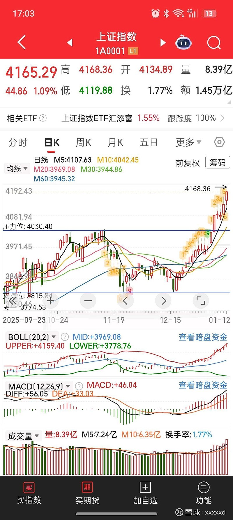 2026.1.12盘后记录: 17连阳,涨幅还很大,是放量大涨,如果不是连涨这么多天了,肯定是满仓猛干了,风险意识迫使今天不敢大幅加仓,日线上大盘也确实没有破坏指标,那么问题来了,这行情还能持续吗?还能持续多久?2026年以来每天都在涨,还没有回调过呢。