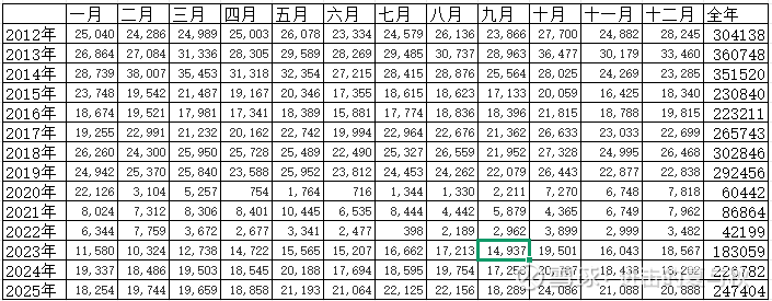 数据表现:2012年全年博彩毛收入达3041.39亿澳门元,2013年增长至3607.49亿澳门元,同比增长18.6%。月度数据普遍处于高位,2013年10月达到单月峰值364.77亿澳门元。
