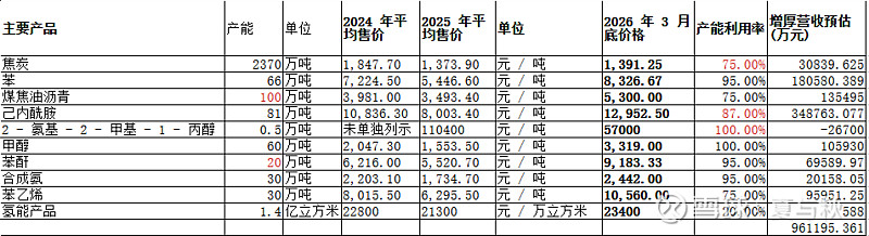$中国旭阳集团(01907)$ 目前甲醇和合成氨板块因市场行情好正处于满产/高产的“黄金期”;焦炭和己内酰胺则保持行业领先的高位运行,假设焦炭产能利用率为2025年的平均产能利用率 75%,结合中国旭阳集团“以焦定化”(即化工产能依赖于焦炭生产的副产品)的一体化生产模式,通过物料平衡法来理论推算其他相关产品产能利用率。大致可以得出主要产品产能利用率为:焦炭75%、苯95%、煤焦油沥青75%、己内酰胺87%、2 - 氨基 - 2 - 甲基 - 1 - 丙醇100%、甲醇100%、苯酐95%、合成氨95%、苯乙烯75%、氢能产品20%。在这个假设条件下,拍脑门按个计算器,可以推算出如下表格数据: