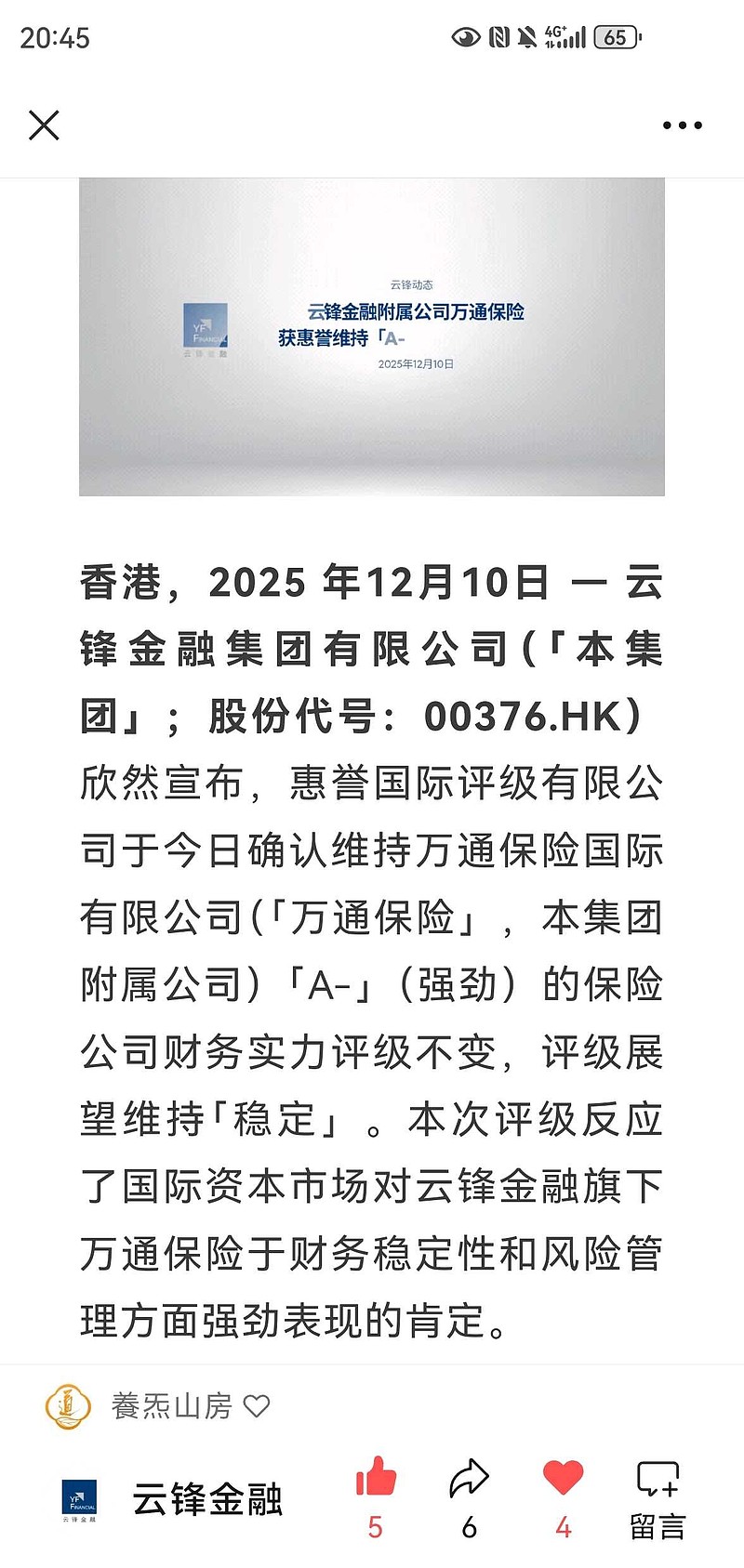 附属公司万通保险获惠誉维持「A-」财务实力评级