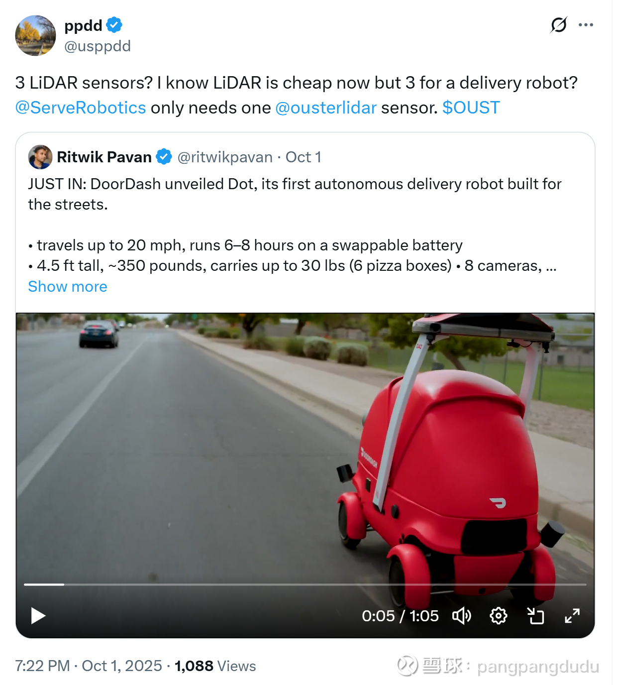 另外,今天禾赛下跌8%应该和这个没啥关系吧?毕竟Doordash机器人发布的时候禾赛也没涨过。查看图片//@pangpangdudu:回复@Siph2018:SERV进展不错,四季度要完成的这1000台机器人需要1000个$Ouster(OUST)$ 激光雷达,应该已经发货了,会体现在Ouster Q3的财报里。Ouster这季度的财报应该会更亮眼,呵呵。
