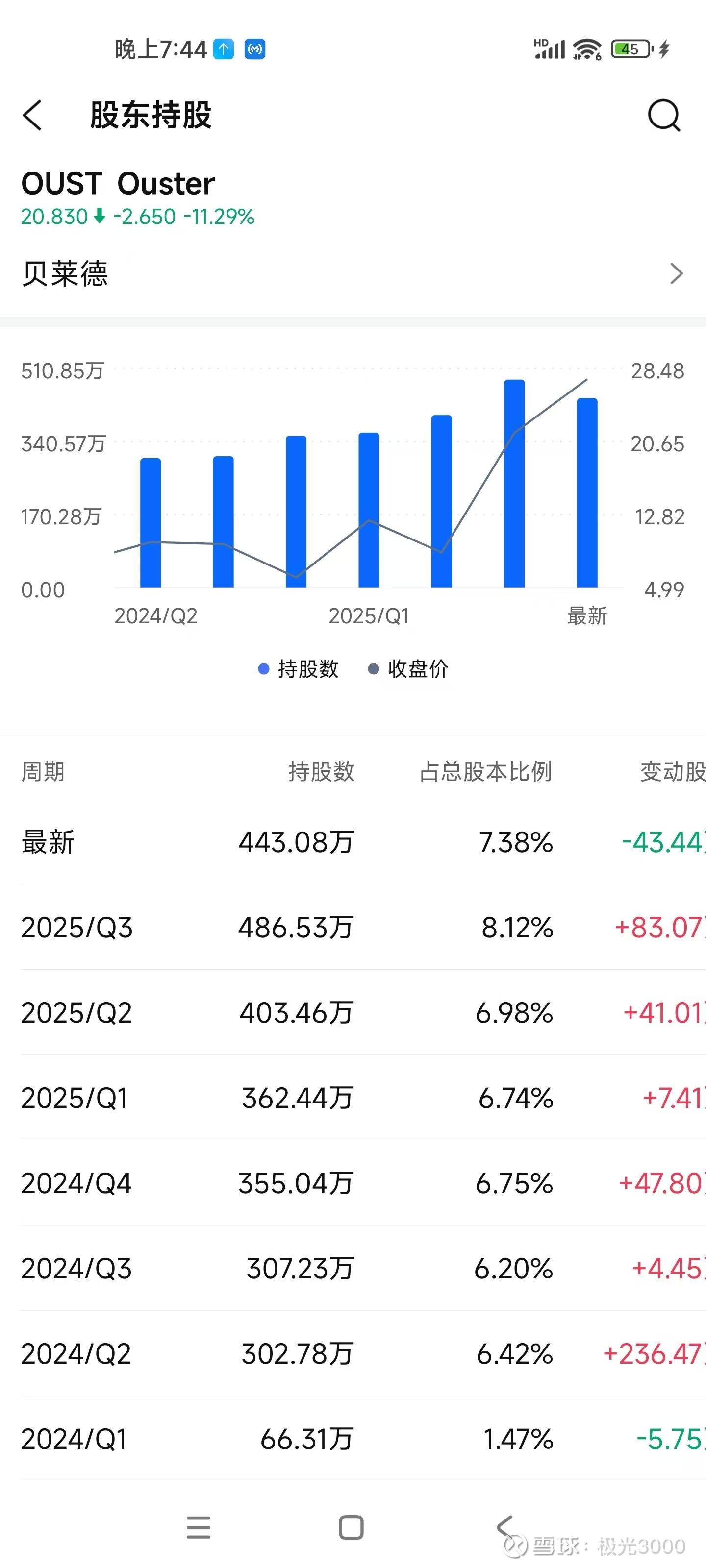 回复@极光3000: 我看到的是这样,不过似乎没有2025年的数据 网页链接 在Ouster公司的网站也没有2025年的任何13G/A filing。查看图片//@极光3000:回复@pangpangdudu:我检查了一下, 应该是BlackRock 202512减仓了43W股 ,而不是增持。我觉得应该是减仓后发了个公告,说明目前占7.38%的股份。 2025Q3 占比最高,为8.12%。大家看看是这样吧?查看图片