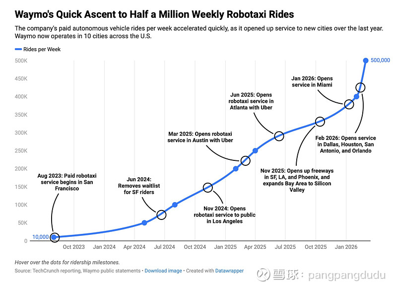 2026年3月,Waymo已经增长到每周50万个订单,不到两年的时间增长了10倍。看下图这个曲线,Waymo正在加速。
