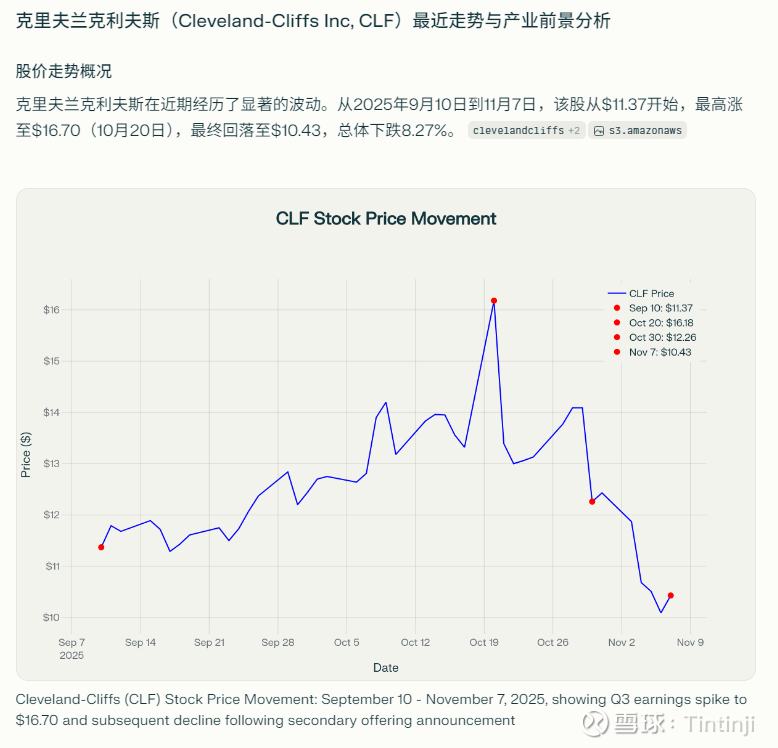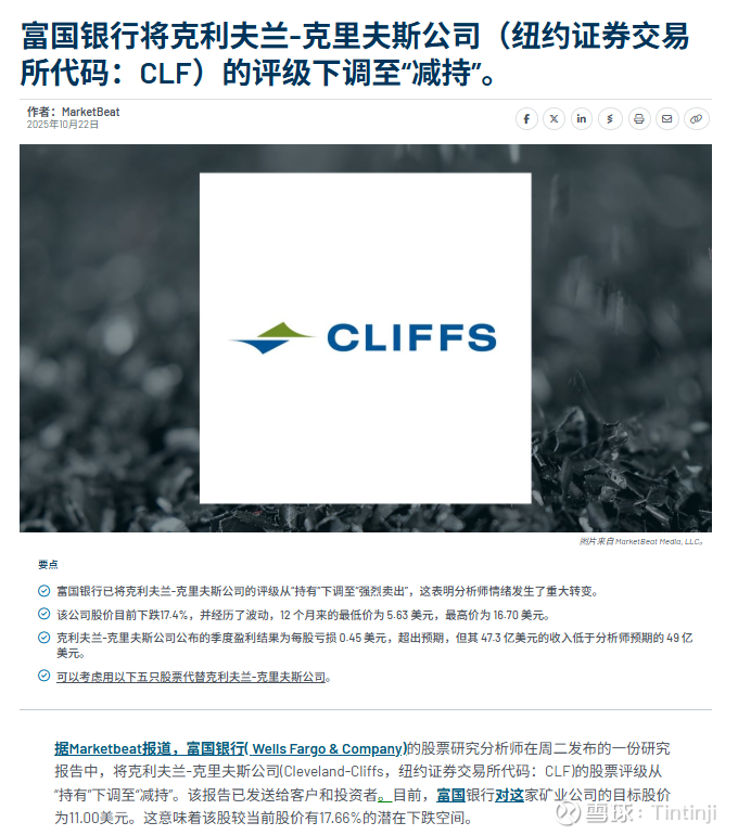 3. 10月21日,在投机性狂热的第二天,机构的“熊市”叙事开始反击。富国银行(Wells Fargo)分析师Timna Tanners将CLF的评级从“持平”下调至“减持” 。该分析师明确指出,22%的涨幅是“过度反应”,并表示“对未知事物的热情似乎过头了” 。富国银行对稀土潜力表示怀疑,指出:“我们不知道该地区有其他矿床,在没有进一步信息的情况下,我们对能否获得有吸引力的回报持怀疑态度” 。这份分析报告代表了机构对基本面的冷静回归。