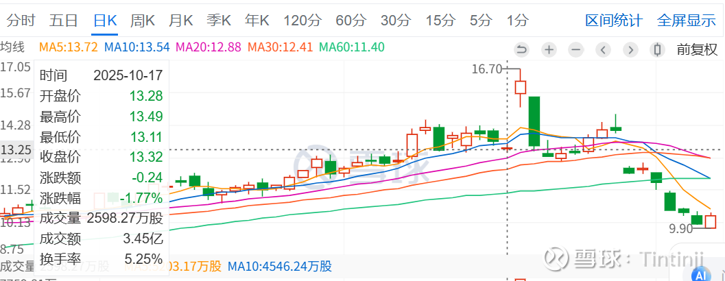 1. 10月17日,收盘在13.32,之后是两天的周末,财报将于20号发布。可以看到,财报前的走势相对平稳,对于一个“老登”钢铁股而言,确实很难暴涨暴跌。