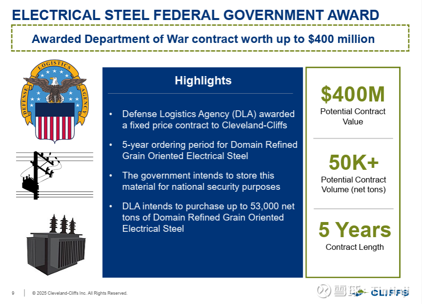 证据2(国防): 在2025年第三季度,CLF获得了美国国防后勤局(DLA)一份为期五年、价值4亿美元的固定价格合同。合同目的: DLA打算购买超过53,000净吨的GOES,用于“国家安全目的”的国家战略储备 。