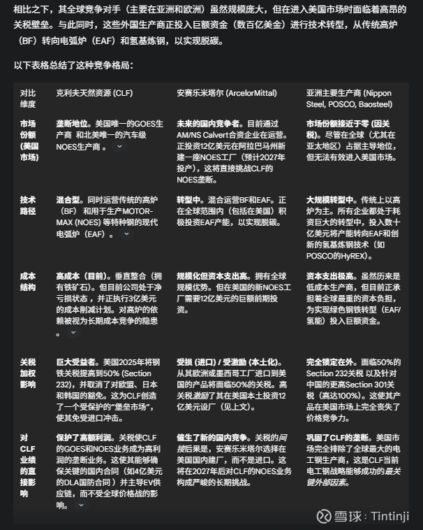 因此,CLF已经通过两条平行的、高利润的护城河占据了两个主要的电工钢市场。其GOES业务(用于变压器)确保了其在电网和AI基础设施(一个非周期性、政策驱动的市场)中的核心地位;而其NOES垄断地位则确保了其在交通和电气化(一个长期增长、高科技市场)中的关键作用。