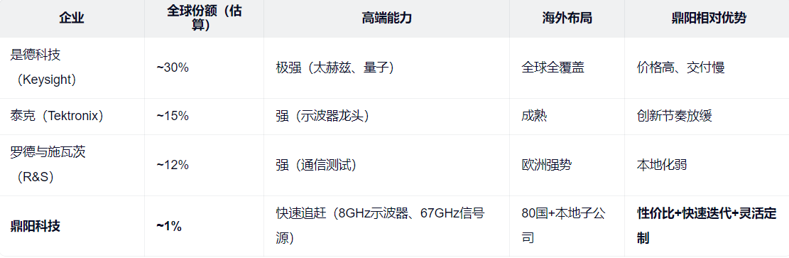 据此估算,鼎阳科技全球市占率约为 0.9%–1.0%。 虽然绝对份额不足1%,但需注意:该市场长期由是德科技(Keysight)、泰克(Tektronix)、罗德与施瓦茨(R&S)等欧美巨头垄断,前三名合计占据超60%的全球份额,国产厂商整体占比极低。