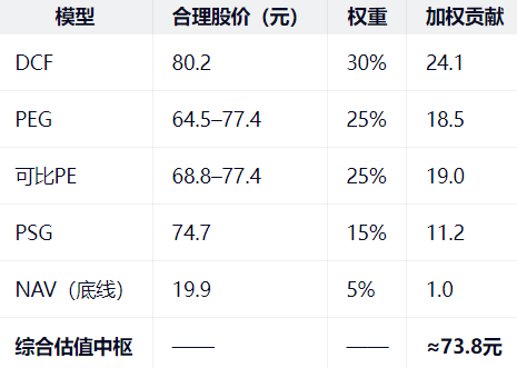 合理估值对应股价区间:68 – 82元。悲观情景市值约48亿,也就是说,下行空间有限。