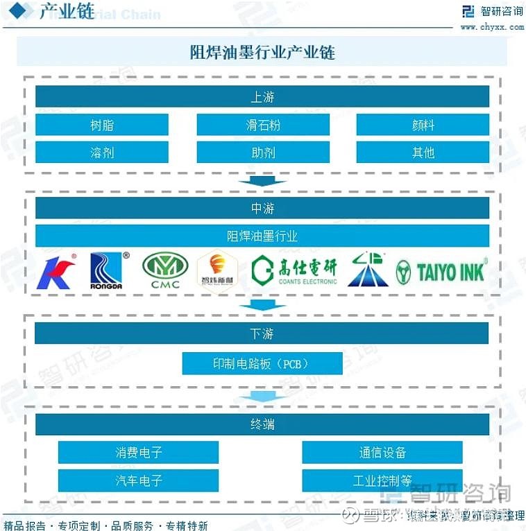 阻焊油墨产业链形成了完整的上下游协同体系,上游原材料供应环节涵盖树脂基材、滑石粉、颜料、溶剂、助剂等关键组分,这些基础材料的性能直接决定了最终产品的品质特性。中游制造环节通过精细化的配方设计和生产工艺,将各类原材料转化为满足不同应用需求的阻焊油墨产品,包括感光显影型、UV固化型、热固型等不同技术路线的专业化生产。产业链下游以印制电路板(PCB)制造为核心,最终用于消费电子、通信设备、汽车电子、工业控制等领域。作为电子元器件的载体基板,印制电路板(PCB)为电子器件产业中最基本的重要电子器件。随着电子行业的不断发展,要求电子设备必须微型化、轻量化,从而促使印制电路板向高精度、高密度和高可靠性发展。阻焊油墨可以对PCB进行保护,可以提高PCB的产品质量,是PCB生产工艺过程中所需的核心材料之一。近年来,随着电子设备不断增长的需求、电子元件的小型化以及无铅焊接的日益普及,阻焊油墨产量在近几年保持稳健增长态势。数据显示,中国阻焊油墨产量从2020年的1.86万吨增长至2024年的2.85万吨,年复合增长率为11.26%。未来,随着智能手机、平板电脑、可穿戴设备等电子产品的普及和更新换代,以及新能源汽车、物联网、人工智能等新兴领域的崛起,电子制造业对阻焊油墨的需求不断增加,预计2025年中国阻焊油墨产量将达到3.13万吨。