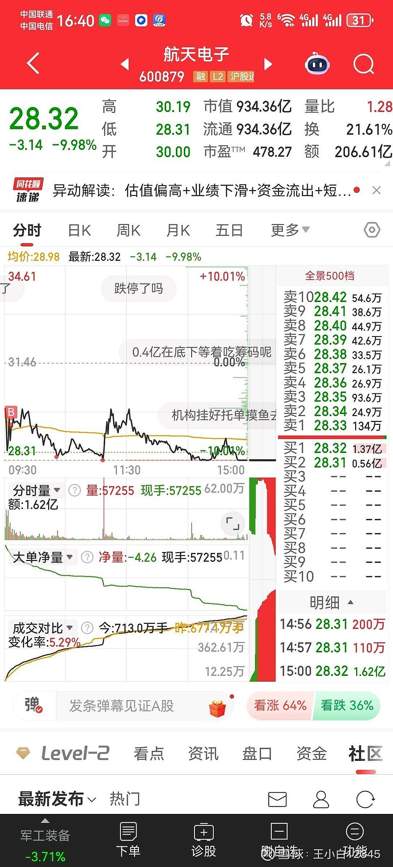$航天电子(SH600879)$ 今天商业航天板块回流,周末听杨老师的课程,在第一次分歧时低吸是一个确定性比较高的买入点。这个不知道算不算。作为一个看好长期趋势的个股,就这样被打压到水下,实在是忍不住要下手分三笔建仓,当时为了成交,基本上都是比大单高几分钱,差别也不大了。尾盘跌停,竞价又翘起来一分钱,不知道是什么猫腻,算竞价抢筹还是单纯不想跌停出龙虎榜。看好明天趋势,水上大概率也不卖,但是水下也要谨慎加仓了