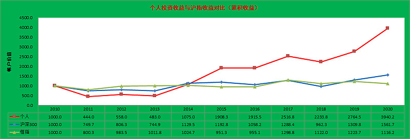 想起了那个经常被拿来说事的段子,每月工资买自家股票的那个,看看我的投资收益率曲线,买远洋真的会变穷吗?确实,刚开始没搞清楚前是巨亏过(2014年前),但后来了解它了,情况就变了,高波动带来更多机会——价投(2013)后,年化收益率35%的曲线是下面这样的: