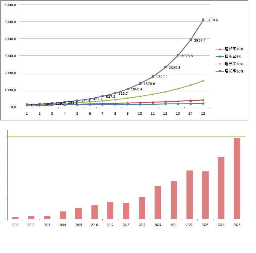 股票投资可以获得实业投资无法企及的成绩,下面第一张图是年化30%的理论曲线与三个“小矮人”(长期投资实业可能获得的收益率)的对比图,下图为实际案例,不如理论曲线平滑,但是看起来也还养眼。