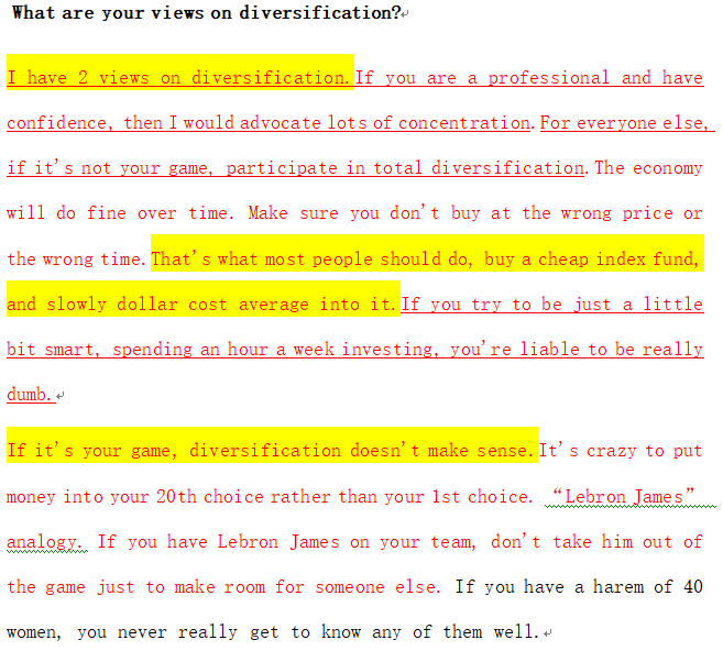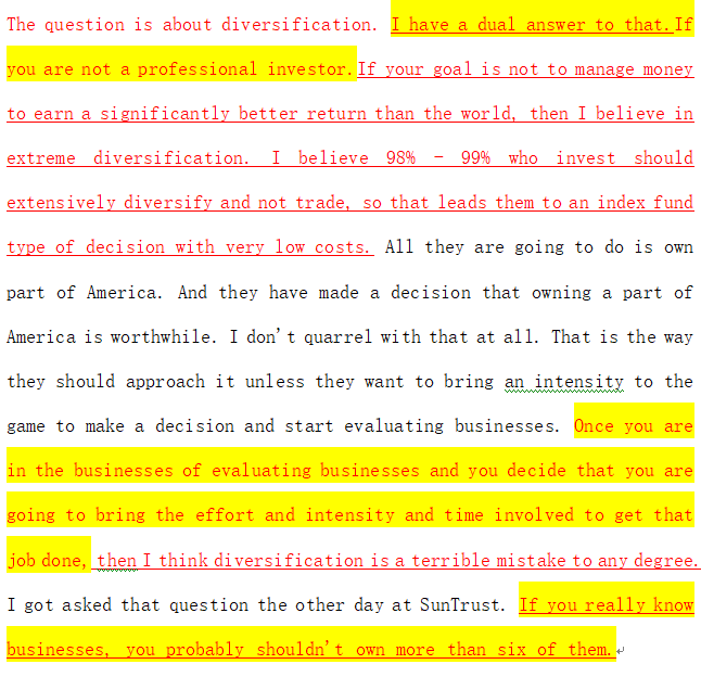 1、关于多元化,巴菲特的观点是双重的,即对于专业投资者,应当集中;对于非专业投资者(他认为98-99%的投资者属于这类),应该充分多元化,甚至仅应该投指数基金。好像还在投指数基金方面打过赌。很多传播巴菲特投资观的人仅喜欢提集中,不喜欢提充分多元化。