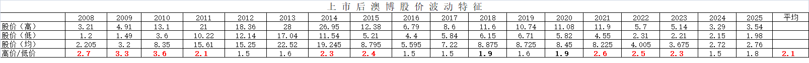 下面是澳博控股上市以来,每年的最低价和最高价情况,中间有个别年份存在股本变动可能会影响比例的真实性,但是年份较少,不做剔除。
