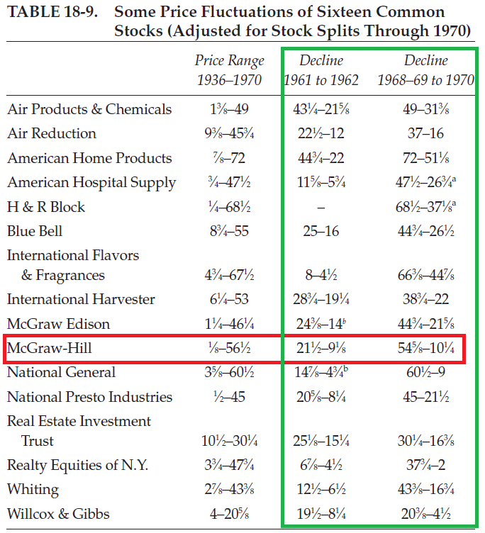 实际上,我们打开任何一直股票的K线图,看不复权的年线最低价和最高价,澳博的情况是一种非常常见的情况,并不特别或并不少见。实际上,你看格雷厄姆的《证券分析》或《聪明的投资者》里面也有一些对股票价格低点和高点的记录,有一个好像是GE的最高最低价,有一个是多家公司的股价变动(下表,来自《聪明的投资者》),其中红框框出来的那家公司还有一个多年高低点变化的表格(证券分析分析的是什么?就是公司和股价的各种数据),等等,如果你注意会发现很多能体现股票价格大幅度变化但属于正常情况的数据。