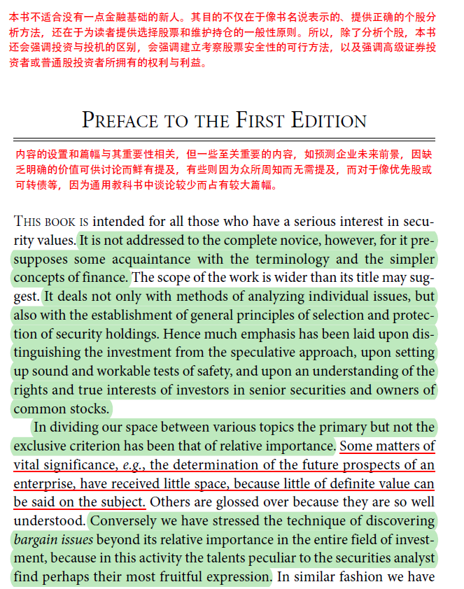 (备注:本来想把读过的书的所有关于这两个概念的备注都贴出来,但是发现太多了,就贴这一部分吧,也足够用了。有很多人接触价值投资是从巴菲特开始的,如果能够认真把格雷厄姆的思想追溯一下可能还好,如果没有做这方面的工作,直接接受巴菲特的理念,可能会对这两个概念有非常大的误解。毕竟内在价值和安全边际是格雷厄姆创造出来的两个词汇,要了解它们的基础意思,还是要追踪最早使用这些词汇人的真实意图,然后,再看别人的发展。其实,也不是什么发展啦,所谓发展的那些内容,格雷厄姆也不是不知道它们的重要性,只不过很难使用证券分析的方法进行论述,这一点在证券分析一书第一版前言中已经明确说明,见下图。格雷厄姆的证券分析是基于已有的事实进行分析,而且侧重定量,这是他理论的优点,当然,你也可以认为这是他理论不够完美的地方。)