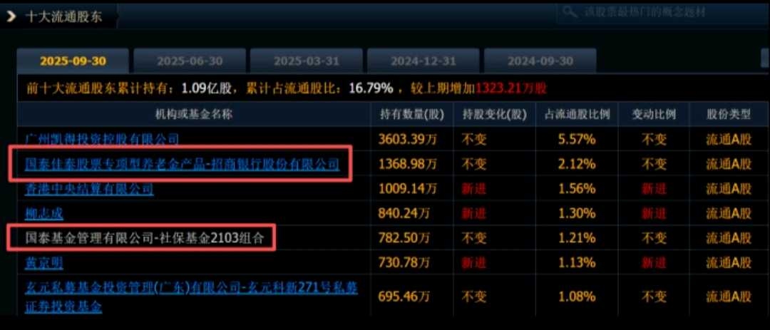 这是泰胜风能(300129) 2025年9月30日的前十大流通股东数据。泰胜风能是风电设备与商业航天领域的核心企业,也是星河动力的合作方之一,其控股股东参与星河动力相关新型技术应用合作,同时该公司也获得了社保基金、养老金等长线资金的持仓布局。