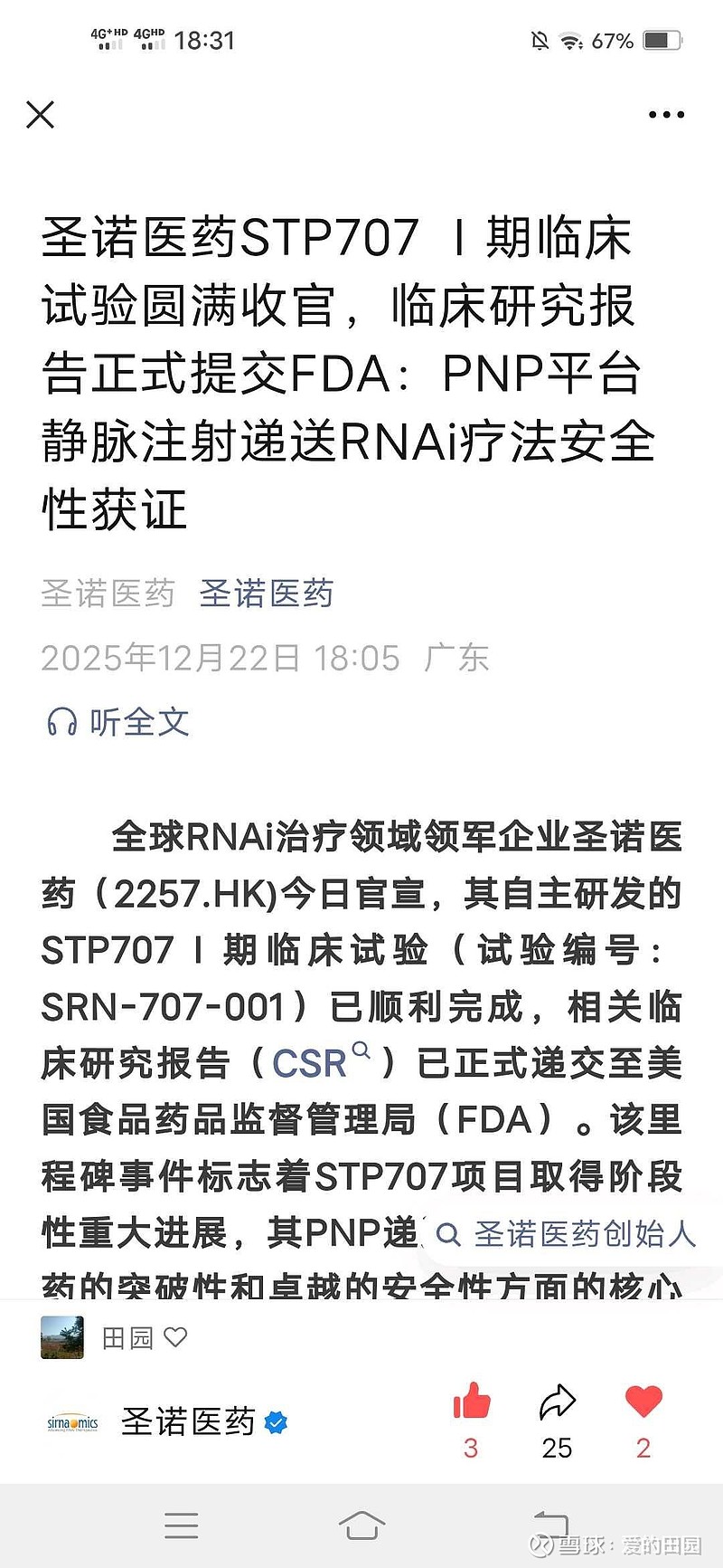 转:全球RNAi治疗领域领军企业圣诺医药(2257.HK)今日官宣,其自主研发的STP707Ⅰ期临床试验(试验编号:SRN-707-001)已顺利完成,相关临床研究报告(CSR)已正式递交至美国食品药品监督管理局(FDA)。该里程碑事件标志着STP707项目取得阶段性重大进展,其PNP递送平台在静脉给药的突破性和卓越的安全性方面的核心优势得到充分验证,为治疗对标准疗法耐药的晚期/转移性实体瘤提供了关键技术支撑。@有理想色彩的骑士