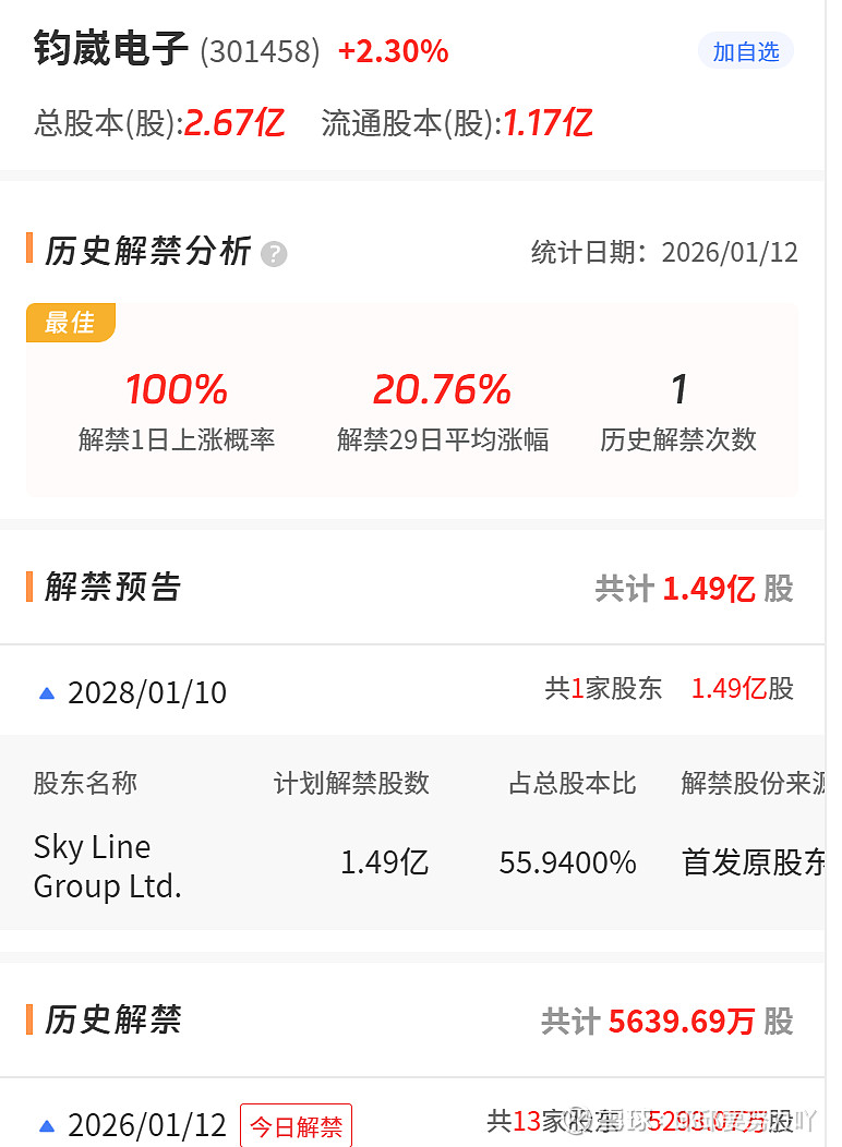 (301458)解禁5639.69万股,该股历史解禁1个交易日内上涨概率100%!