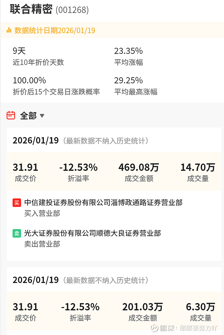 (001268)以12.53%的折价率成交21万股,数据表明,该股历史发生大宗折价后15个交易日内100%上涨!平均涨幅29.25%!