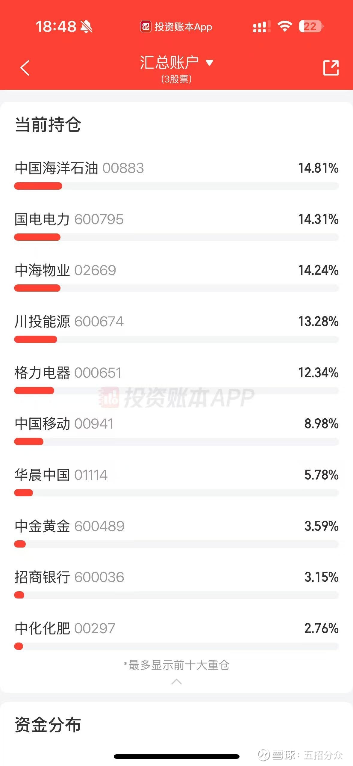 主账户位含登量足海油、国电、物业、川投、格力、移动(9%H和新买1.6%A)基本属于买够了,这几个目前占比当前约仓位70%。