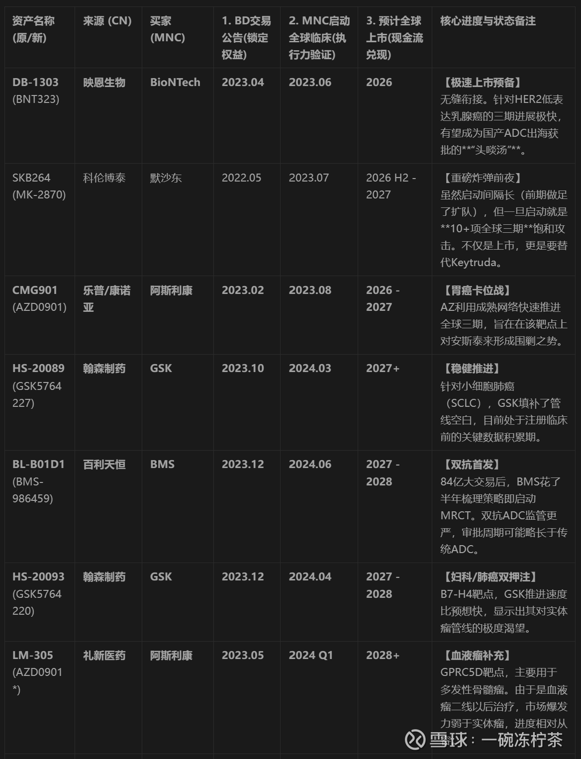 ADC用中国的临床能力快速完成Poc,海外用替代终点推动上市,门槛低,买家多:以科伦博泰、荣昌生物为代表的ADC玩家,不仅通过License-out获得了巨额现金流,更重要的是,它们保留了独立完成中国甚至全球关键临床并商业化的能力。默沙东买科伦的TROP2 ADC(中国完成poc,已经上市),买回去直接进三期、准备三年内推进上市的。这种“成品出口”模式,支撑了企业从Biotech向Biopharma的估值跃迁。