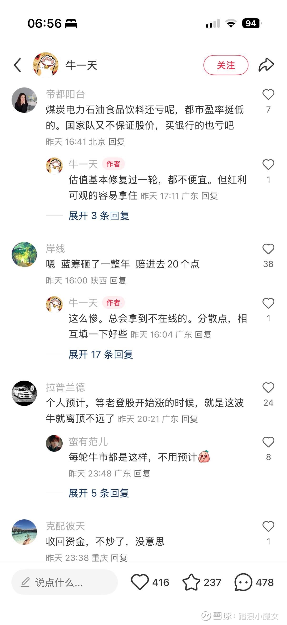 你不可能指望那些非常爱炒题材打板的人做潜伏的,给他机会下次还是打板,就像省大永远最终走向保本出一样,所以现在外面解释那么多理由为什么这么低了还砸盘啥的,我觉得可以看也可以不看,真能等这些低位股起来的也只有类似我这种非常爱捡漏的人,大家各管各的就行,时间到了自然转换,太纠结牛熊反倒容易影响发挥![]()