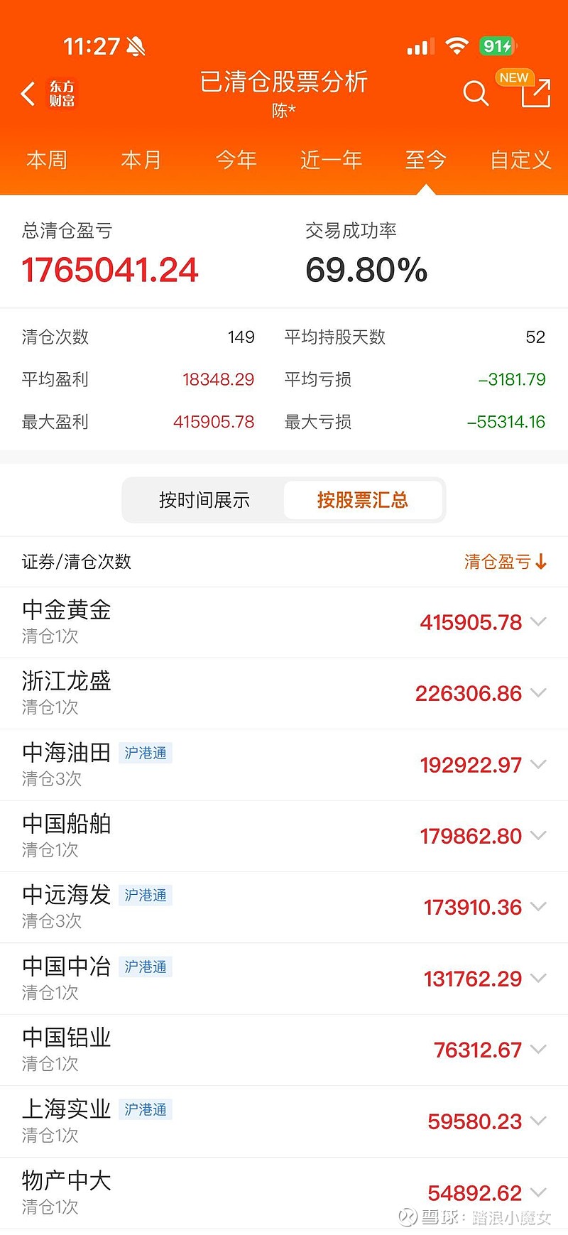 我之前发帖说了,八字不合的我就想象成破船,硬熬到拉了赚钱反正合得来合不来我都要尽量争取赚钱再走,合得来的无非是可能多玩几次,然后让我心情愉悦点体验感好点,但是不可能因为我觉得跟你合得来赚钱不走,搞得好像股票永远只涨不跌一样,感觉差不多赚到我就走,不要没事秀操作我赚的都是好多只股积累而成的,不是某一只股一战成名,所以会更心疼我的钱,有些人来钱容易就不珍惜,哪怕一开始玩的特别牛的股也能把好牌打烂,那就不能怪别人哦,是你自己的问题,我看看也就参考下,怎么操作是自己的事