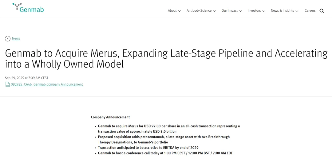 当地时间2025年9月29日清早,Genmab官宣将收购Merus N.V.(以下简称为“Merus”)。根据协议,Genmab将以每股97.00美元的现金收购Merus的全部股份,交易价值约80亿美元。这是Genmab自成立以来最大的一笔收购(去年收购普方生物总价为18亿美元)。