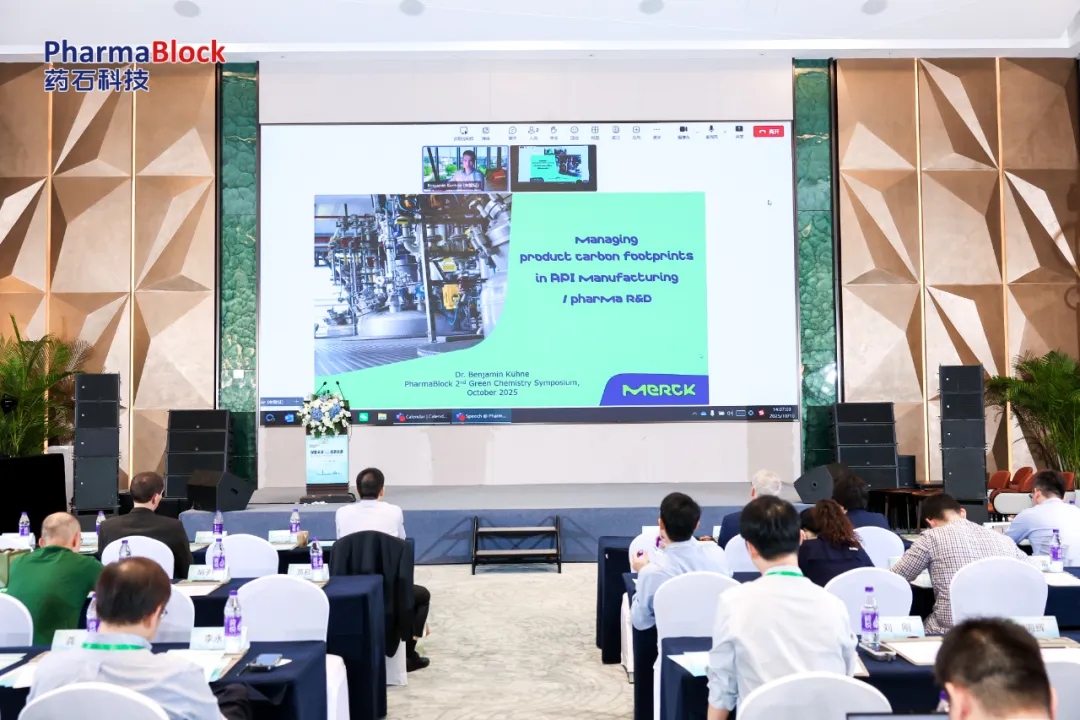 Merck KGaA(默克集团)可持续发展评估全球负责人Benjamin Kuehne博士,围绕API生产与制药研发中的产品碳足迹(PCF)管理展开分享。他首先介绍默克的可持续发展承诺,提及公司聚焦创新技术可持续性、可持续供应链,高度关注联合国可持续发展目标(SDGs)落地;指出化学制造的气候变化影响是行业长期关注点,PCF是衡量化学品环境影响的关键指标,默克已通过多年行业合作推动PCF管理技术与标准完善。