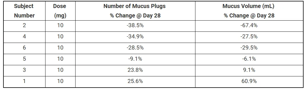 在此次公布的二期中期研究中,仅经28天ARCT-032(10mg)治疗,6例CFTR蛋白完全缺失型(I类)CF患者中,4例黏液栓数量及黏液体积呈现有意义的下降(平均减少量:黏液栓-34.0%,黏液体积-40.3%)。