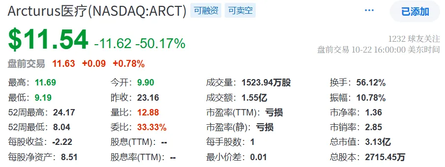 2025年10月22日,Arcturus公布CF新药ARCT-032二期临床试验中期数据后,股价单日暴跌50.17%。