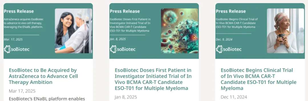(1)2024年12月11日,EsoBiotec宣布在中国启动其体内CAR-T产品ESO-T01的IIT(研究者发起试验);