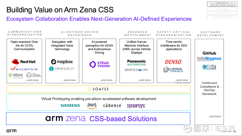 Arm方面强调,其软件策略聚焦四大原则——安全、智能、易用与生态支持。尤其在生态方面,依托SOAFEE等开放标准以及覆盖EDA、云计算、整车厂和软件开发商的全球合作生态,Arm 加速推动技术落地。