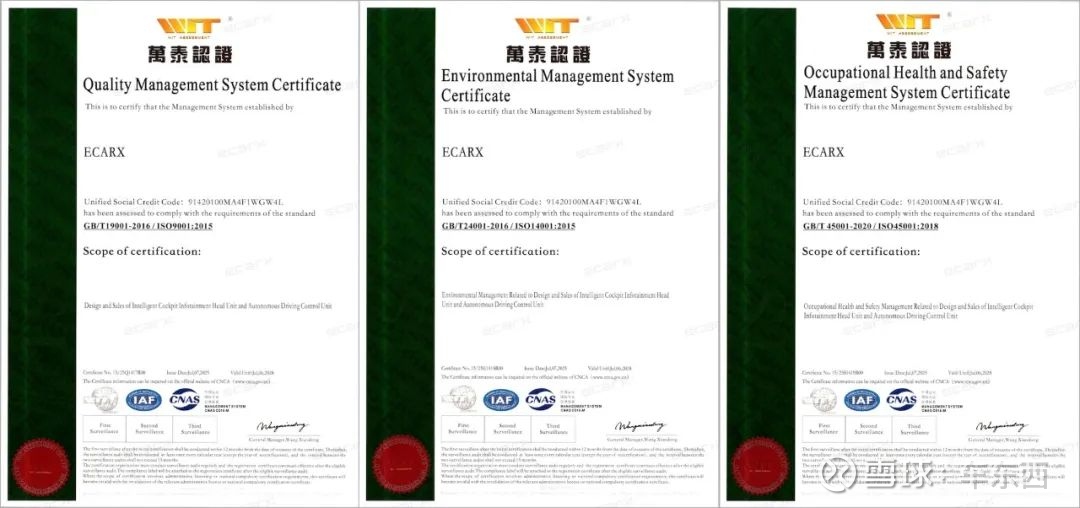 此外,亿咖通还通过了“三体系”认证:ISO9001质量管理体系、ISO14001环境管理体系和ISO45001职业健康安全管理体系,这不仅体现了其在质量、环保与员工安全方面的责任,也为全球业务稳健运营和长期可持续发展打下坚实的安全根基。