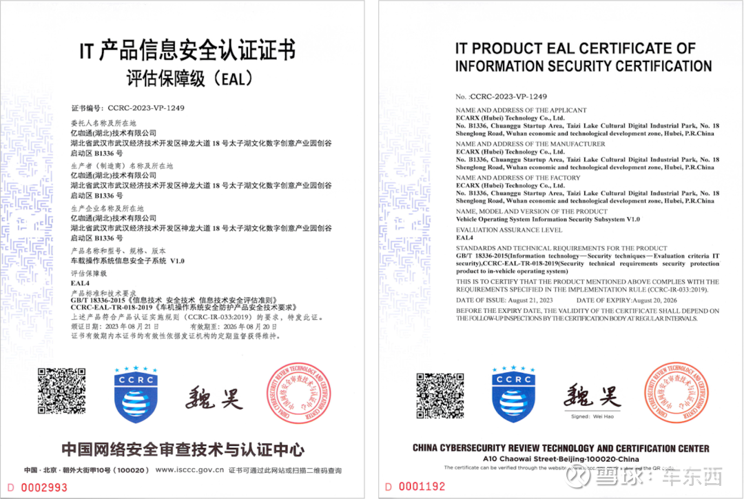 2023年8月底,亿咖通科技宣布正式取得由中国网络安全审查技术与认证中心(CCRC)颁发的,授予亿咖通·云山(ECARX Cloudpeak)跨域系统能力底座的IT产品信息安全认证(EAL4)证书,成为汽车行业首家获得该国际化认证的公司。