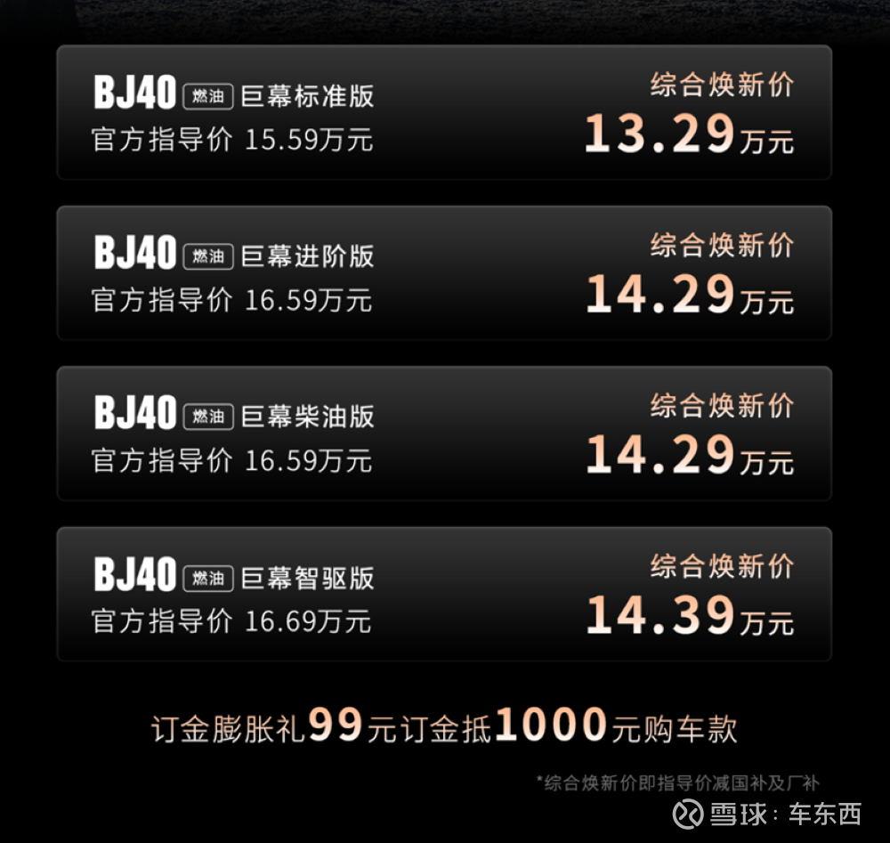BJ40燃油巨幕版官方指导价15.59-16.69万元,综合焕新价低至13.29万元,同时拥有订金膨胀礼:1月27日下订,即可享受“99元订金抵1000元购车款”优惠政策。