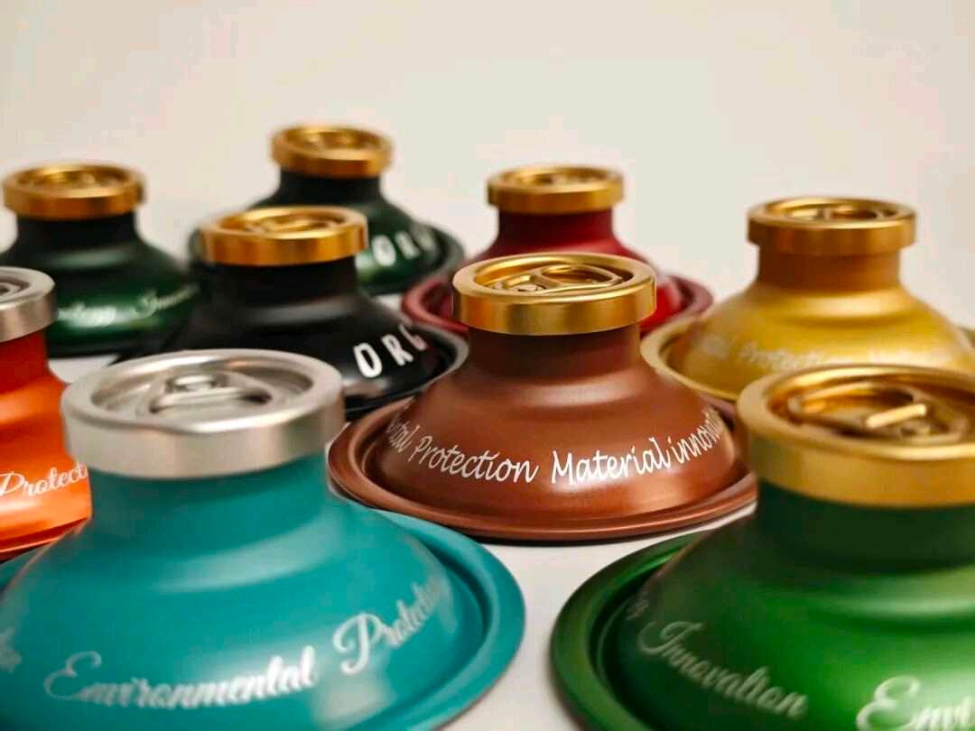 为此,奥瑞金技术团队迎难而上,针对罐身色彩与表面处理进行多轮攻坚,共设计8种颜色方案、4种表面触感光油方案供测试比选。更专门为高颈盖开发了“磨砂+鎏金”涂印工艺,通过表面纹理的细腻触感和颗粒感的流动金属光泽,在视觉与触觉层面均实现跨材质、跨规格的高度协同。
