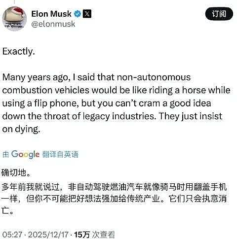 特斯拉首席执行官埃隆·马斯克在社交媒体X上直言不讳地评论福特汽车的电动化战略收缩:没救了,他们非“死”不可。他还表示,非自动驾驶燃油汽车就像骑马时用翻盖手机一样,但你不可能把好想法强加给传统产业。