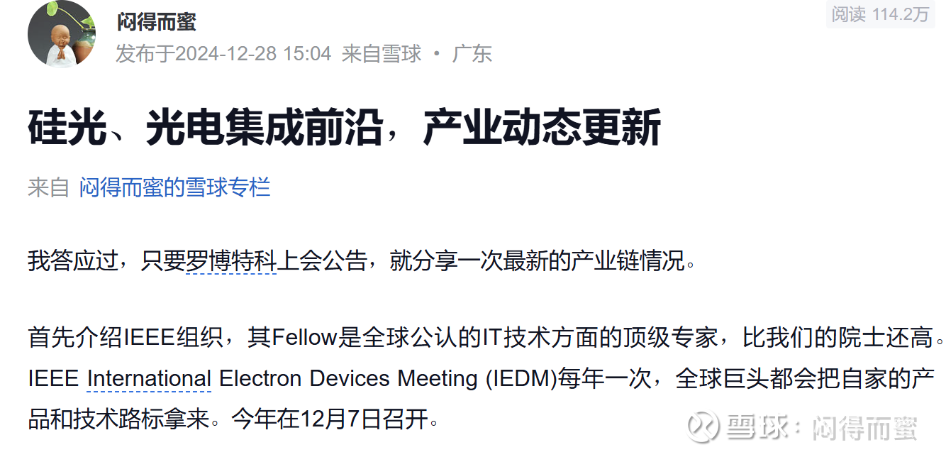 罗博特科的基本面呢,其实一直没有太多变化。台积电在12月中旬发布的COUPE工艺技术路线,我一直按住到12月底才解读,因为担心对市场有一定冲击,隐约提了一下。