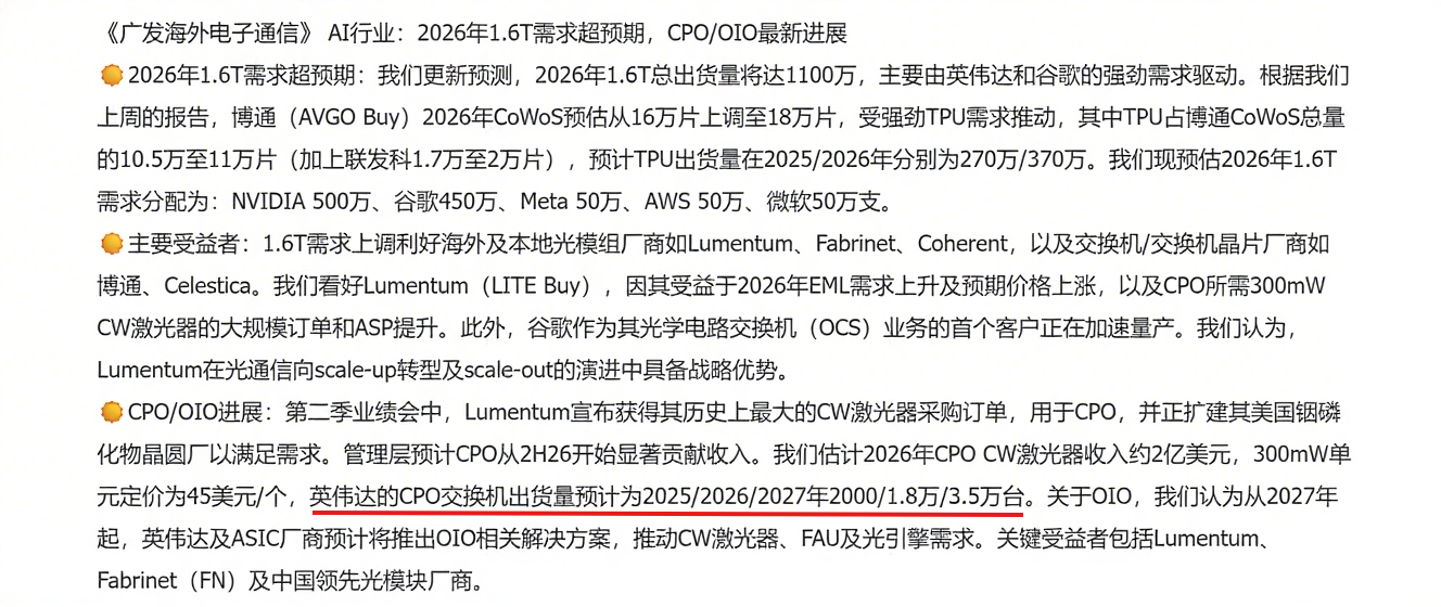 1、CW 激光器是 CPO 交换机的核心物料,其供需变化直接反映 CPO 产业化进度。当前产业链核心玩家 Lumentum 已拿到大额订单并启动扩产,这并非单一企业行为,而是下游 CPO 需求放量的明确信号 —— 订单落地意味着终端客户(如英伟达、博通)CPO 产能规划已进入实质执行阶段,侧面印证 “CPO 未来已来”,产业从技术验证向规模量产的过渡正在加速。