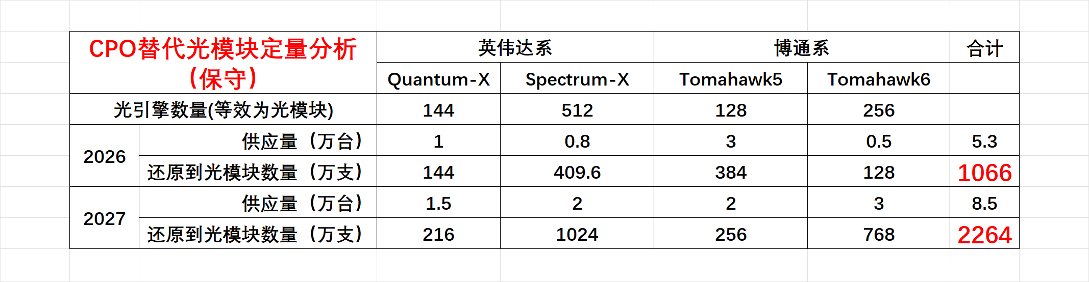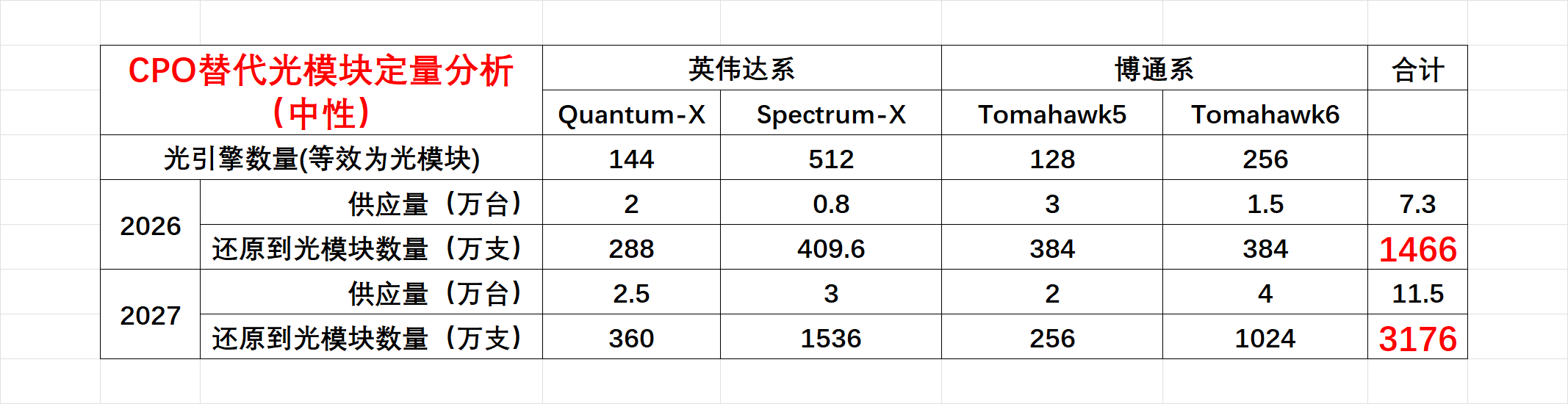 5、修正的中性值: 2026年CPO等效替代1200万支光模块;2027年CPO等效替代2500万支光模块。