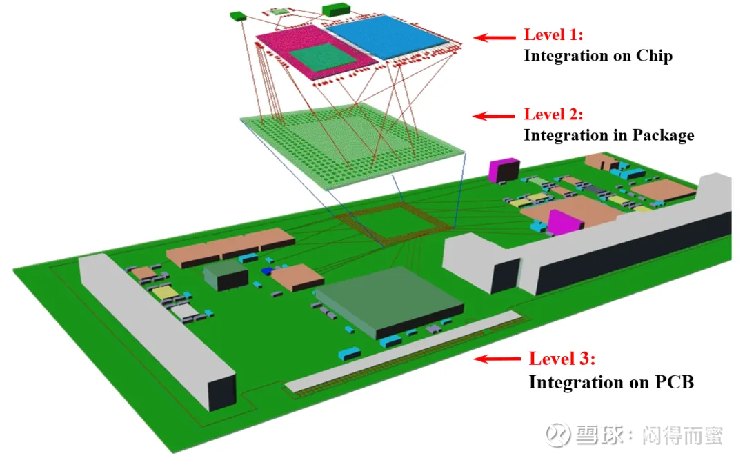 1、NPO(Chiplet CPO):把光引擎下沉在 Level3 PCB 板上,通过 socket 做成可更换的,实现光互联与主芯片的解耦。