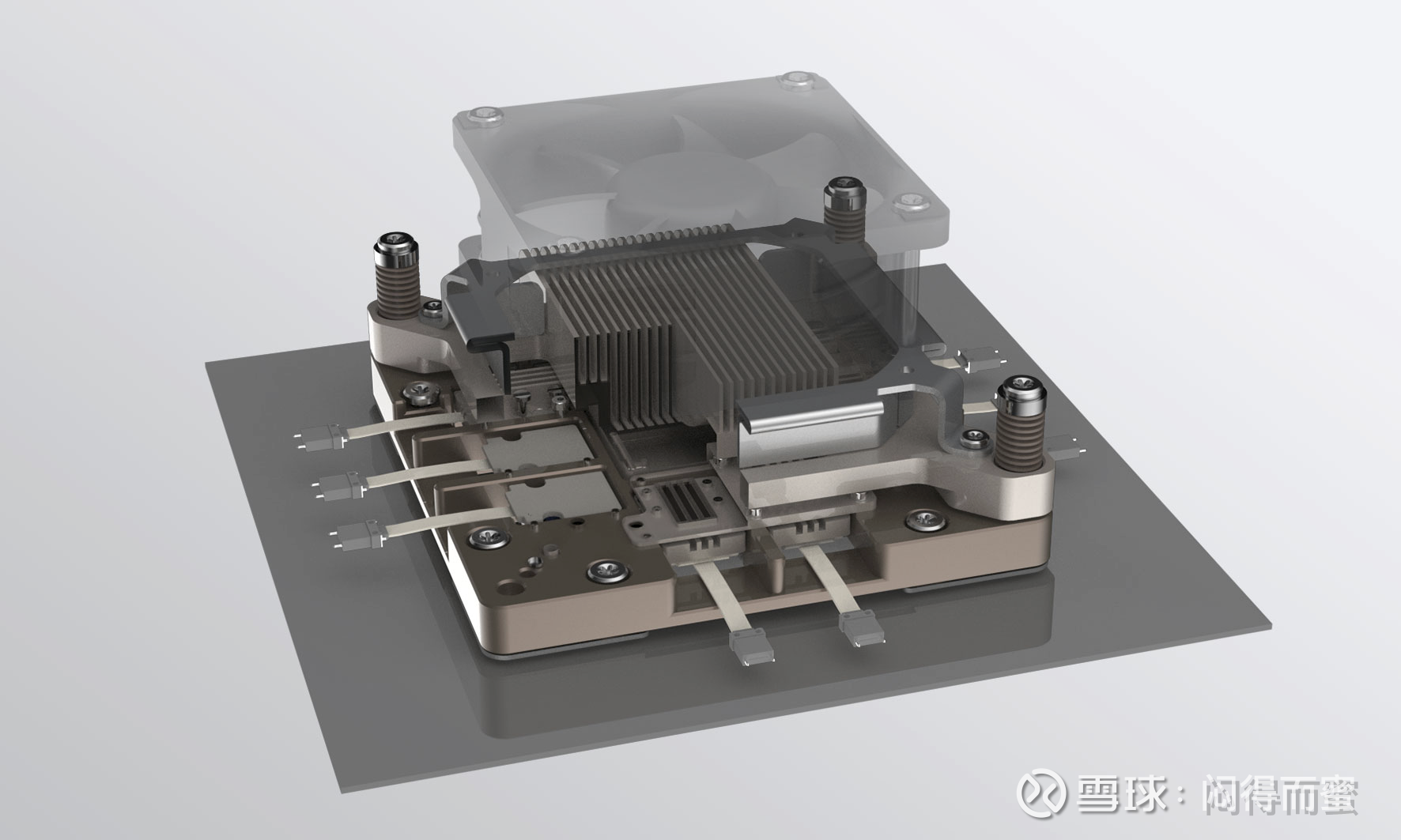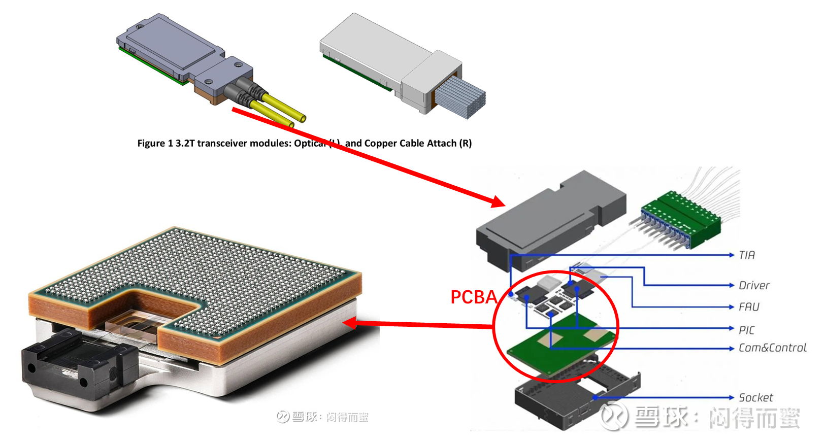 NPO引擎通过socket与PCB底部链接;光引擎内部是一块PCBA母版,各PIC、EIC用flip-chip工艺集成。