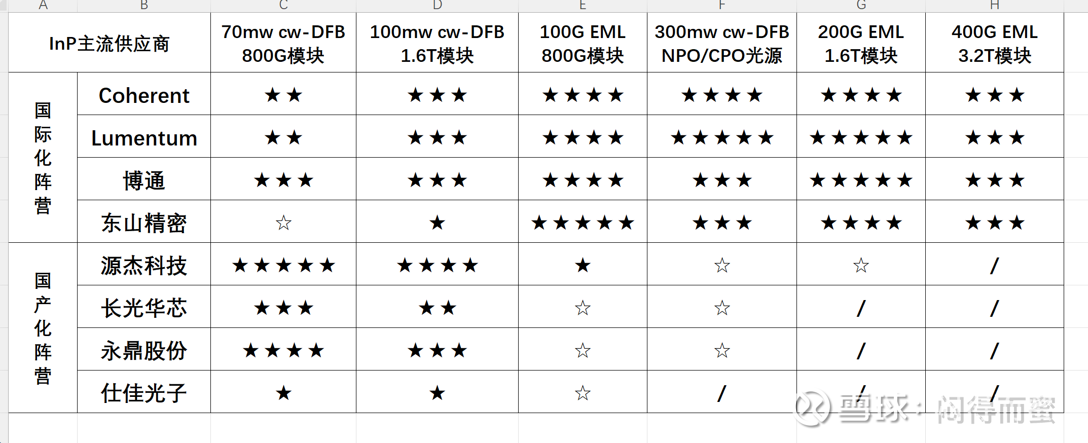 InP(磷化铟)体系是有源光器件核心,发光效率高,是800G/1.6T光模块、CPO的关键载体,全行业产能缺口约30%-40%。EML主打高速长距传输,适配数据中心互联等场景;cw-DFB窄线宽、可无制冷工作,为硅光模块提供稳定光源。其短板是衬底昂贵、集成难度高。