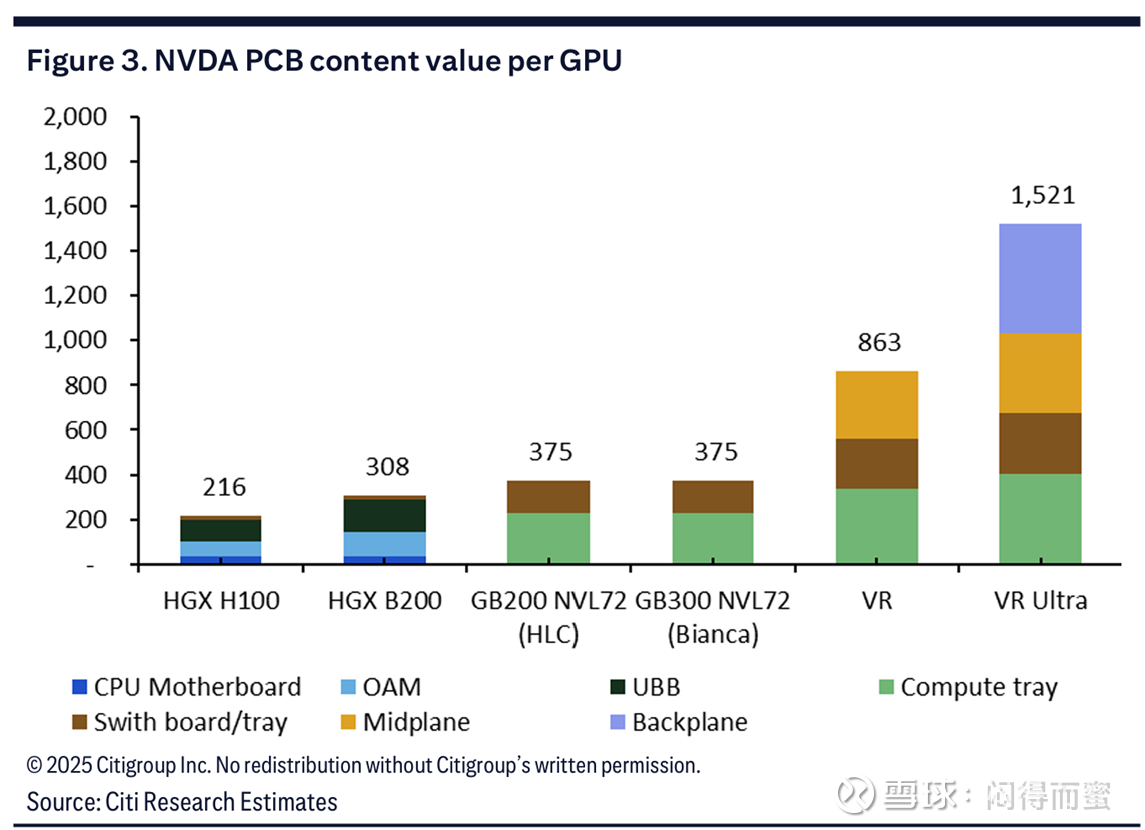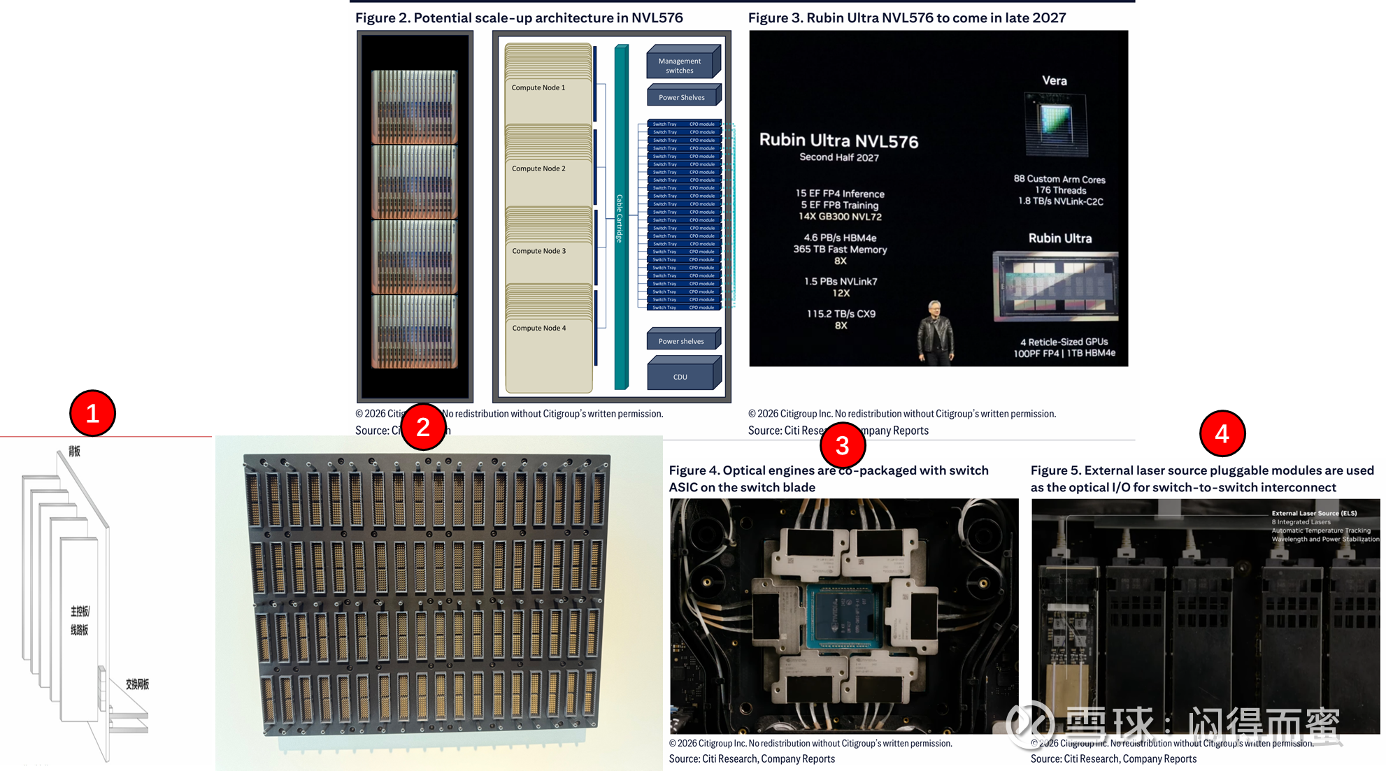 计算刀片和母版(OAM & UBB):每块刀片集成 4 颗 Rubin Ultra GPU(每颗 4 个 Reticle-sized 芯片,100 PFLOPS FP4、1TB HBM4e)和 2 颗 Vera CPU(88 核 Arm、1.8 TB/s NVLink-C2C),通过背板与交换刀片直连。