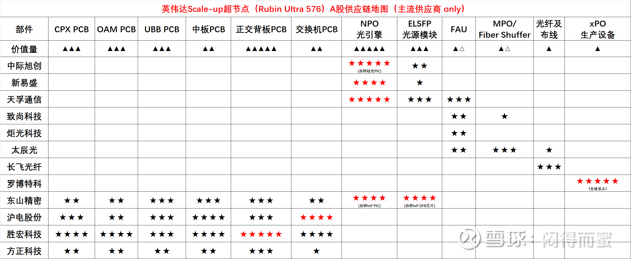 基于表格中红色★(核心主流供应商标识)的分布,获得四颗及以上的企业集中在PCB、光引擎和xPO 生产设备三大核心环节,且均为英伟达 Rubin Ultra 576 超节点的关键壁垒提供商。以下是针对这些企业的精准点评,兼顾产业逻辑与投资视角,适配专业分析场景:
