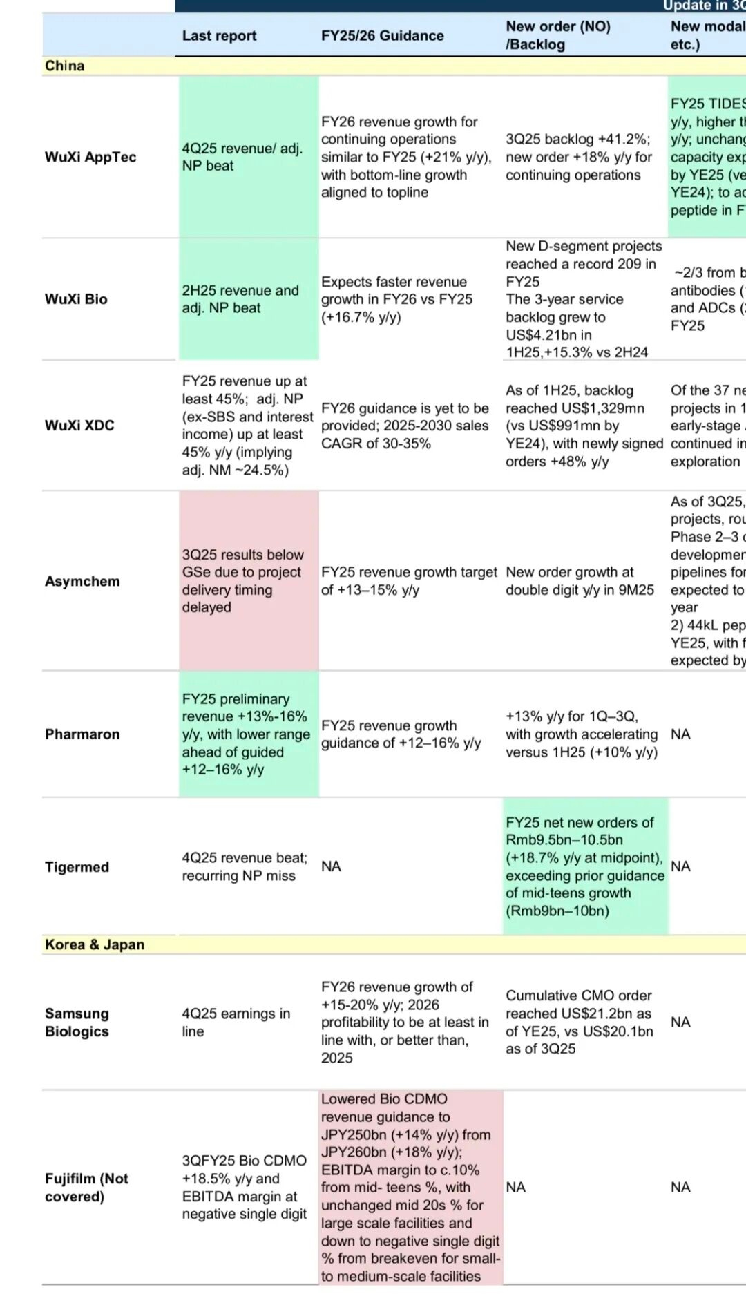 区域表现分化:中国头部CDMO项目活动和订单保持韧性;而印度同行业绩指引出现下调,欧洲(龙沙)、美国(龙沙、赛默飞)及韩国(三星生物)龙头则普遍给出积极指引。