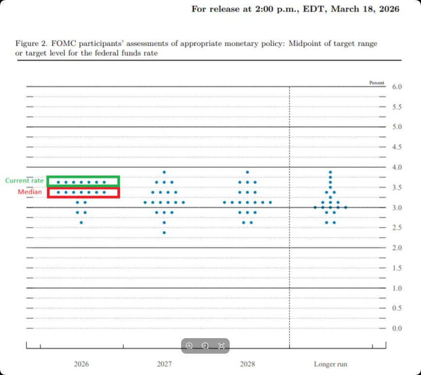 点阵图(Dot Plot)预期:*年内降息一次:尽管面临通胀压力,点阵图的中值依然维持了2026年降息1次(25个基点)的预期,年底利率中值预测维持在3.4%。